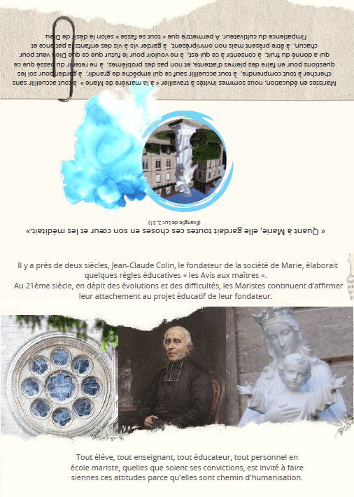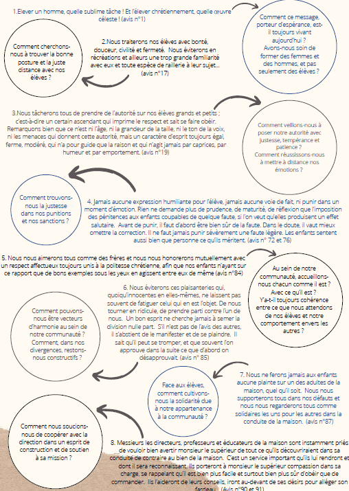En 2023, avec le groupe Maristes en éducation de Saint-Vincent (Senlis), nous avons décidé de nous pencher sur les Avis aux Maître de Jean-Claude Colin. Notre idée de départ était de voir si ces règles éducatives, élaborées il y a deux siècles, nous parlaient encore aujourd’hui et si nous pouvions les « réécrire » dans un style plus moderne. Cela a fait débat, certains voulant conserver le style et les mots originels, d’autres non… Concrètement, après lecture, nous avons sélectionné huit avis qui concernaient davantage nos propres préoccupations et, plutôt que de les réécrire, en avons tiré une question qui pouvait interroger les membres de notre communauté d’aujourd’hui.